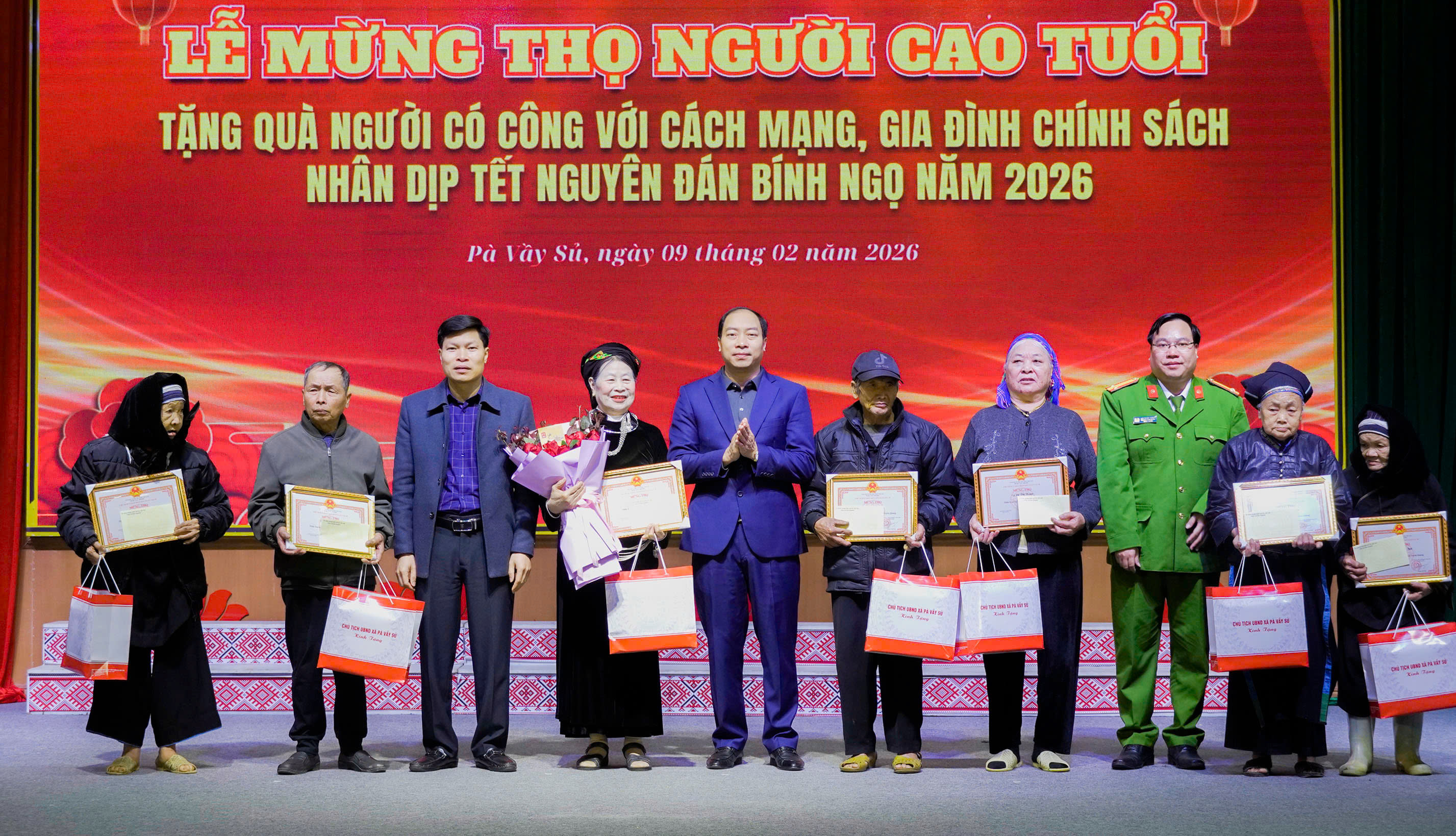 Tại buổi lễ, xã Pà Vầy Sủ đã tổ chức mừng thọ cho các cụ tròn 90, 85, 80, 75 và 70 tuổi trao chứng nhận mừng thọ và quà chúc mừng. Đây không chỉ là sự tri ân mà còn là nguồn động viên tinh thần để các cụ sống vui, sống khỏe, tiếp tục là tấm gương sáng cho con cháu noi theo. Dịp này, xã Pà Vầy Sủ cũng trao quà Tết cho các đối tượng người có công, gồm người nhiễm chất độc da cam, con liệt sĩ, thương binh, bệnh binh và gia đình chính sách. Những phần quà tuy giá trị vật chất không lớn nhưng chứa đựng tình cảm, sự sẻ chia của Đảng bộ, chính quyền và Nhân dân địa phương, góp phần giúp các gia đình đón Tết ấm áp, đủ đầy hơn. Đây là hoạt động thường niên thể hiện truyền thống “uống nước nhớ nguồn”, “kính lão trọng thọ” và sự quan tâm của cấp ủy, chính quyền đối với các đối tượng chính sách, người cao tuổi.